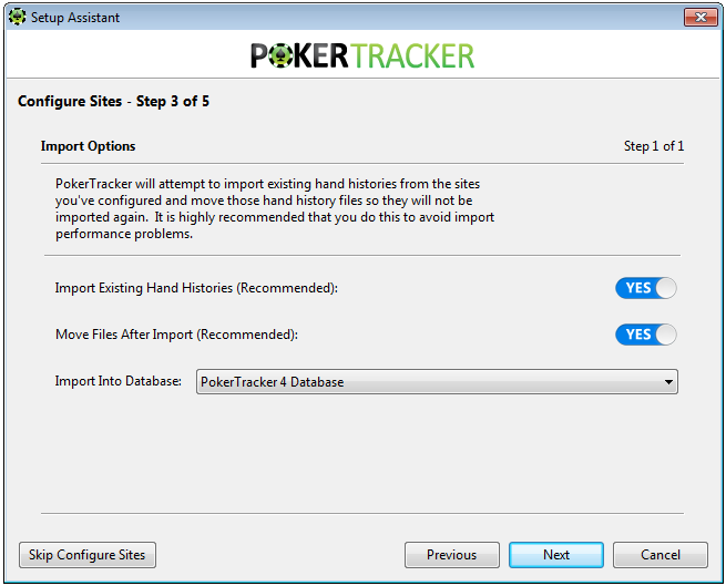 Прежде чем приступить к эксплуатации приложения потребуется провести настройку Poker Tracker 4. В этом деле также не должно возникнуть недоразумений, поскольку тут все происходит достаточно просто. Если уж и появятся какие-то проблемы, то всегда можно воспользоваться воспроизводящимся при запуске утилиты специальным помощником Setup Assistant.
