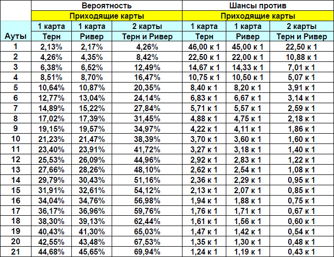 Однако если нет желания осваивать таблицы, то можно воспользоваться еще одним, более простым методом. Каждый покерист знает, что каждая карта может прийти к нему с идентичной вероятностью. Так, как после раздачи условно в наборе остается 47 листов, то провести оценку вероятности нужного можно приблизительно в 1/47 или 2% случаев. Эту цифру, как правило, учитывают профессиональные игроки.