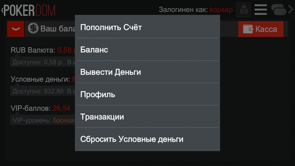 Что же касается мобильного приложения ПокерДом, то здесь есть все те же функции и возможности, как и в приложении, которое скачивается на персональный компьютер. Точно также можно будет пополнять свой счет, выводить выигранные деньги, проверять вип-баллы и бонусы, переводить деньги другим пользователям и принимать переводы. А о последних изменениях своего игрового счета можно также узнать в меню кассы, кликнув кнопку «Транзакции».