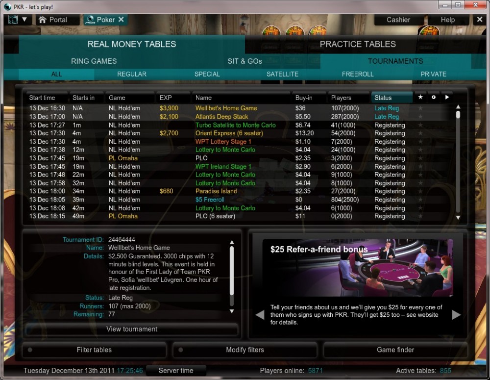 Скачать PKR Poker. com главным образом должны те юзеры, которые предпочитают турниры. Это объясняется тем, что в МТТ турнирах, проводимых комнатой, редко когда участвует больше, чем несколько сотен пользователей. К тому же именно ярые приверженцы турнирных игр смогут без особенных усилий показать свое мастерство и выиграть средства у действительно слабых оппонентов.
