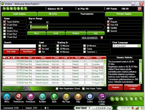 Рум Юнибет Покер каждый час организовывает фрироллы, где минимальный призовой фонд составляет десять евро. Максимальная сумма при этом ровна 150 евро.
