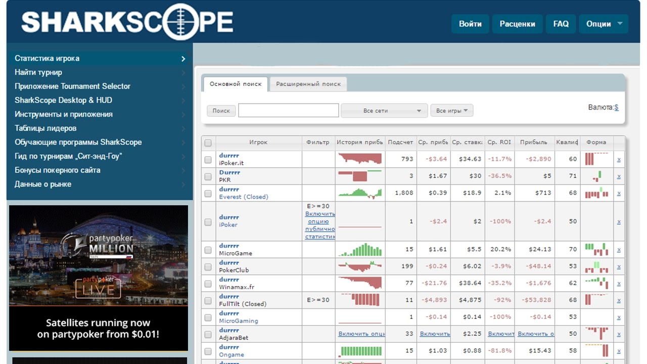 Сегодня наиболее востребованным среди покеристов порталом покерной статистики является ресурс SharkScope. На сайте находится информация по самым масштабным покерным баттлам, которые проходят в крупнейших румах.